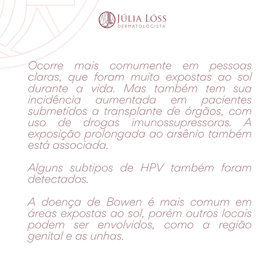 A doença de Bowen, embora seja um câncer de pele in situ, inicial, pode evoluir para o carcinoma de células escamosas invasivo, se não tratada.